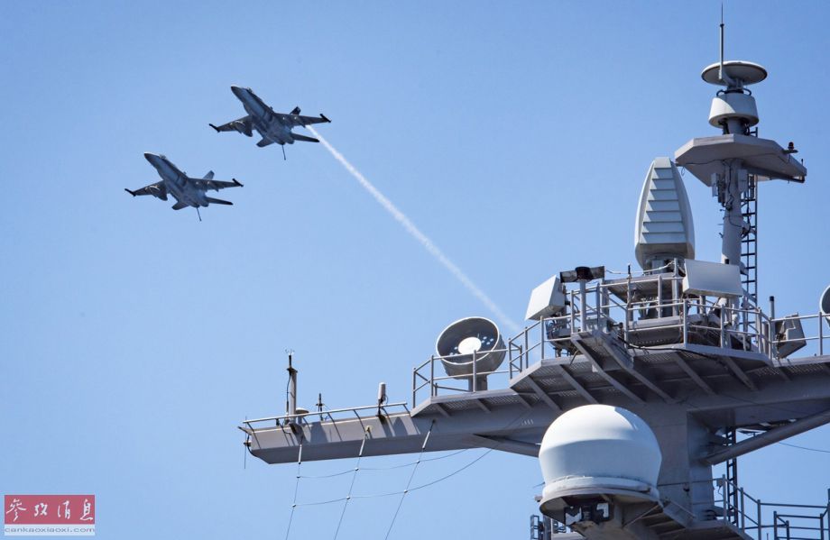 2架“大黄蜂”战机从“文森”号航母上方飞越,还放下了尾钩。