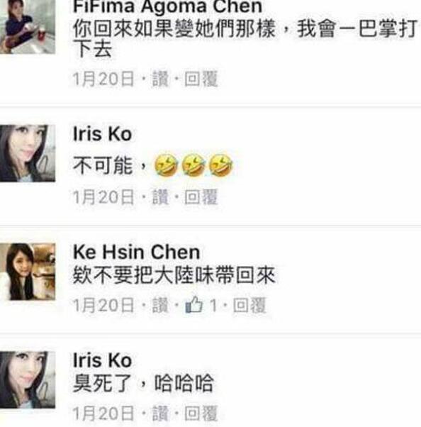 据台湾“联合新闻网”12日报道,这名“脸谱”名为Iris Ko的台湾女子,被所在公司厦门美莱医疗确认叫作陈可晴。她在“脸谱”中与朋友对话,花式辱骂大陆人,像是“臭死了”、“俗爆了”、 “很难搞”。