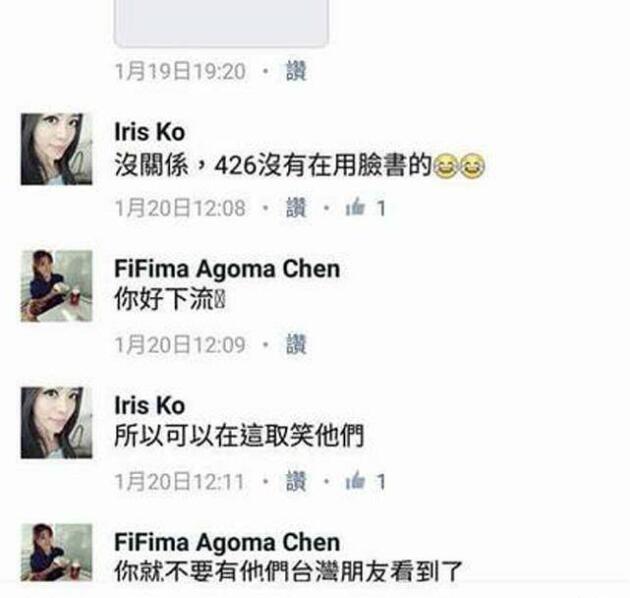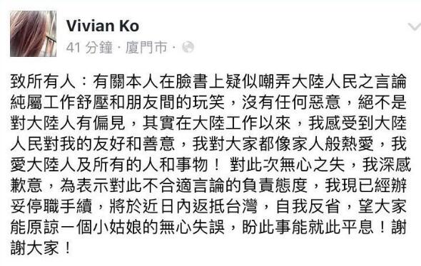 据了解,该台湾女子已将“脸谱”内容删除,并改名为 Vivian Ko,随后更新了一条致歉声明,声称,不当言论是无恶意的玩笑,“希望大家能够原谅一个小姑娘的无心之失”。