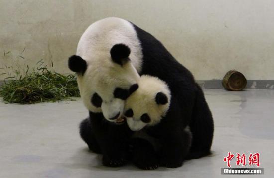 大陆赠台大熊猫圆圆则忙着用脸搓搓圆仔的小脸。中新社发 台北市立动物园供图