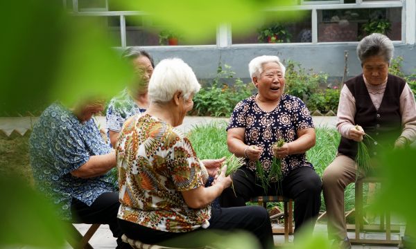 资料图片:北京大兴区赤鲁村的几名老人在养老服务中心聊天