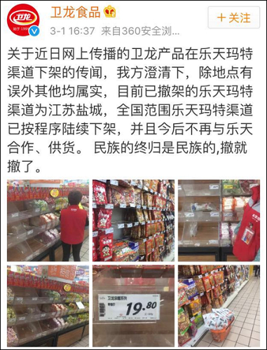 不过,卫龙食品强调,商品将会陆续从乐天在大陆所有的卖场下架,而且“今后将不再与乐天合作”。公告最后表示,“民族的终归是民族的,撤就撤了”。