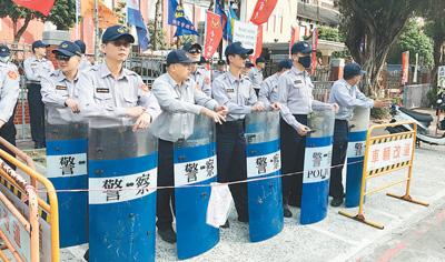 执行民众陈情抗议勤务的台北警察在立法机关门前严阵以待。记者 冯学知摄