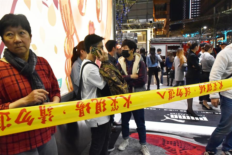 3月29日,市民在警戒线外观望。截至3月29日22时20分,台北信义威秀影城内部人员已全部疏散。为安全起见,影城电源已切断,楼层一片漆黑,消防正在往外排烟。