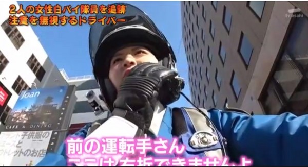 据台湾“东森新闻网”4月5日报道,日本朝日电视台的警察执勤纪录节目“列岛警察搜查网THE追迹”,最近播出春季事件,影片中,熊本市女警察骑着800C重机,在路上巡逻,忽然发现有车在禁止右转路口等右转,女警察立即广播告诉驾驶员“这里不能右转”,不过车上驾驶员并不为所动,此时警笛响起,女警要求停车。