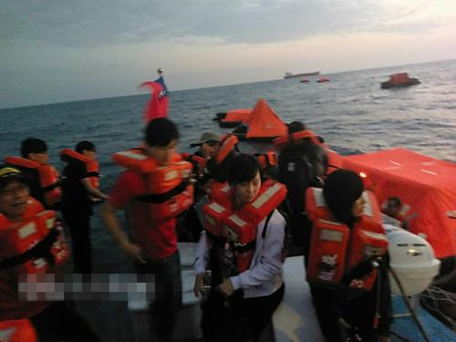 图为海巡队将乘坐救生艇的游客救上巡防艇。图片来源:台湾“中央社”