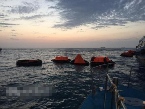 图为海巡队赶往时, “凯旋3号”已放下救生艇。图片来源:台湾“中央社”
