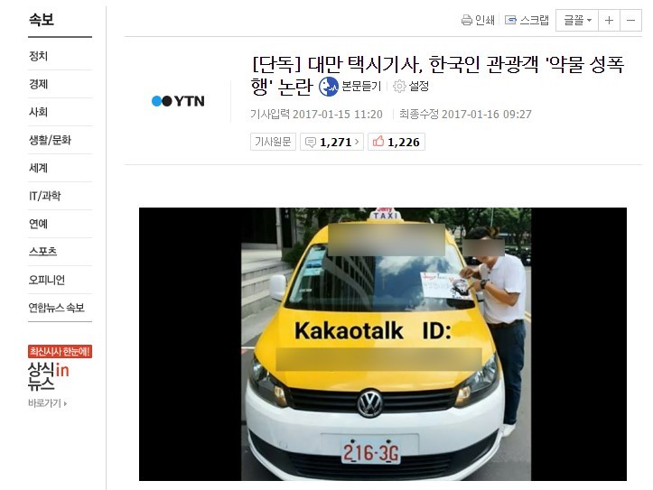 韩国《JTBC》电视台主播称,“在台湾旅游的20多岁女大生,遭到计程车司机性侵,她们在喝了司机给的养乐多后,失去意识”;《YTN》主播说,“在台湾旅游的两名韩国女性,遭到当地计程车司机性侵”;《SBS》电视台也请来记者和主播讨论该新闻。