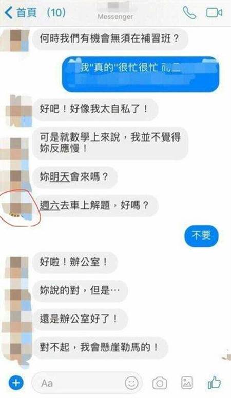 据台湾“中时电子报”5月3日报道,少女作家自杀身亡,让台湾补习班的“狼师风波”越演越烈,被挖出“狼师”数目可能让父母心惊。30日有网友贴出脸书对话截图“另一位台南名师的手法”,对方不仅说话露骨,甚至说出“下次我要吃奶”这句话,并说想看女学生穿短裙,越短越好,还想约女学生车上解题。