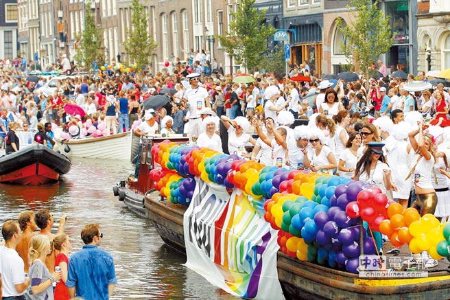 荷兰于2001年4月1日正式承认同性婚姻合法化,是全球第一个承认同性婚姻的国家。图为2011年8月6日,荷兰阿姆斯特丹王子运河的船只游行活动中,代表“同性恋”的船只在万众瞩目下通过运河。(图片来源:台湾《中时电子报》)