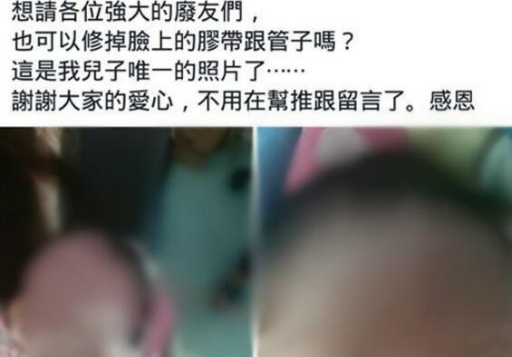中国台湾网6月26日讯 据台湾“东森新闻云”报道,一位丧子的妈妈,在网络上贴出两张新生儿的照片,征求“P图大神”替她的儿子修一张身上没有胶带和管子的照片,她在文末加注:“这是我儿子唯一的照片了。”这位妈妈怀胎9月却遭遇难产,网友们听后纷纷给她打气。