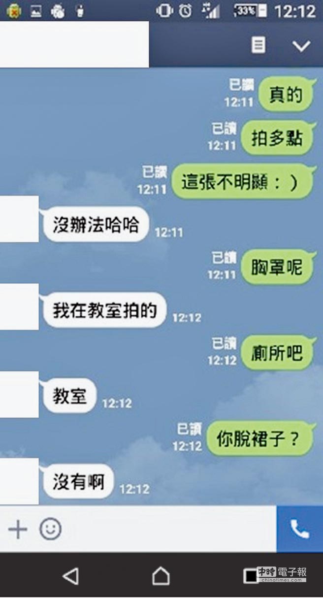林和骏与被害少女的通讯软件对话,指导少女拍摄姿势。 (图片来源:中时电子报)