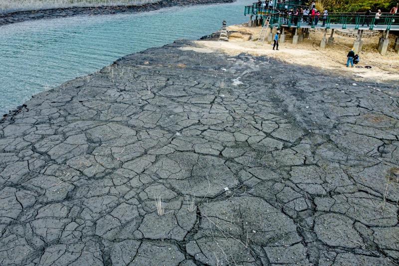 中部地区的蓄水情况也逐渐紧张,日月潭著名景点“九蛙叠像”近期浮出水面,部分潭底已露出,也出现干涸、龟裂的现象。