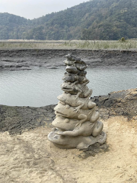 报道称,日月潭风景区管理处表示,2022年入冬后日月潭区没有下雨,潭区配合供应下游农业灌溉用水,蓄水一直入不敷出,使得水位骤降,不仅大竹湖区的“九蛙叠像”九蛙全露出,连水上自行车道也露出来了。据台媒此前报道,“九蛙叠像”在2020年、2021年也曾出现九蛙全露。
