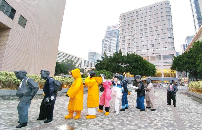 放置于香港文化中心的《人间系列-排队》中,有十个造型各异的人物,排着队等待着进入馆内。除了以鲜艳的服装颜色区别外,每个人身上不同的配件也是重点。在雕刻技法上,人物都以1980年代后“太极系列”的做法,以发泡胶塑形,再根据个别需要加以修整。虽然尺寸已经放大到跟真人一样大小,不过脸部五官仍然以简略的方式来表现。