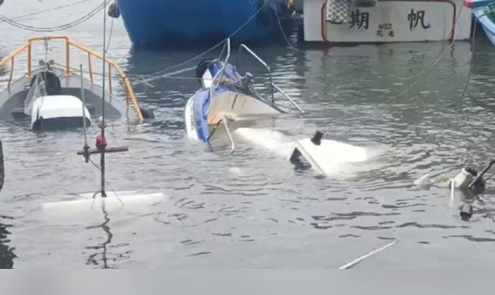 富冈渔港有2艘渔船疑因摇晃剧烈碰撞浸水沉船,渔民损失惨重。图片来源:台湾《联合报》尤聪光摄。