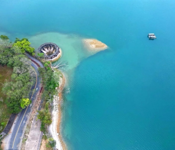 近日民众阿正再度往日月潭边跑步,顺道空拍潭面美景,再度在溢流井附近拍到水位下降而出现的潭底沙洲,溢流井有如鸟眼,沙丘形似鸟嘴,恰巧一旁有渔民的船筏驶近,空中俯看就象是“小鸟吃虫”一般。