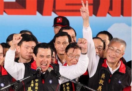 马英九与副手吴敦义上台并高举双手发表谈话。他表示,“恭喜大家,我们赢了”。 (图片来源:台湾《中时电子报》)