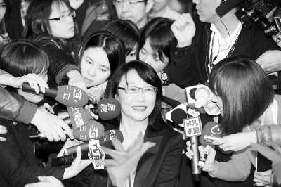 1月15日晚,王永庆之女、宏达电(HTC)董事长王雪红在台北出席HTC年终尾牙,受到大批记者追访。她接受采访时说,马英九的当选显示台湾民众对两岸和平的重视,希望未来以和平为基础,能重新再出发,为台湾打拼。董会峰摄(中新社发)