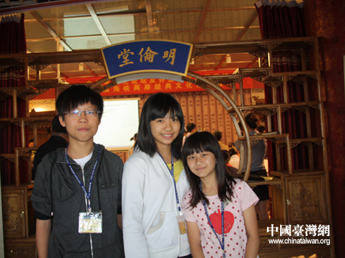 中华孝文化论坛14日上午在济南孔子文化会馆举行,台湾50余名老少客人参加了活动,图为参加讲座的三名台湾小朋友。(中国台湾网 杨丽 摄)