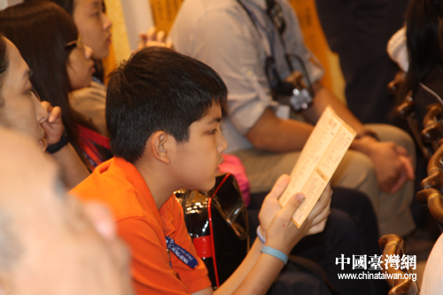 中华孝文化论坛14日上午在济南孔子文化会馆举行,这名台湾小朋友在专注地研究活动安排。(中国台湾网 杨丽 摄)