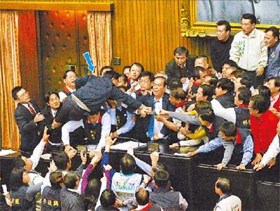 中国台湾网1月19日消息 据台湾《苹果日报》报道,台湾“立法院”昨日召开临时会审查“地方制度规定修正草案”,国民党强行表决三读通过。在历时70分钟的表决过程中,蓝绿大打出手,而蓝军凭借人数优势,终于使提案完全按照国民党版本过关,台湾“五都”(台北市、台北县升格后的新北市、县市合并后的大台中市、大台南市和大高雄市)乡镇市长排除负面表列者,将可转任区长,乡镇市民代表转任无给职区政咨询委员。