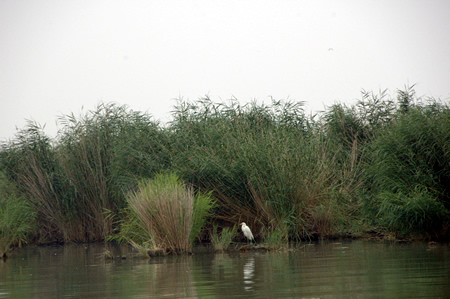 湖水碧波荡漾,沙海金浪起伏,记者团一行乘船漂过湖面,一荡一荡的芦草在眼前掠过,偶尔游船可以贴近芦草,用手轻轻地拂过去,手心里就掀起一波柔软的滑滑的芦草浪花。初夏,新苇如茂林修竹,郁郁葱葱,或如港汊,或如街巷,或如华盖,或如屏障,微风吹来,绿影摇曳,婀娜多姿。沙与水似天造地设的伴侣,相互偎依,相映成趣,刚柔并济之中美得沁人心脾。