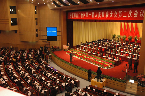 2009年1月14日上午9时,宁夏回族自治区第十届人民代表大会第二次会议在宁夏人民会堂隆重开幕,这是开幕会现场