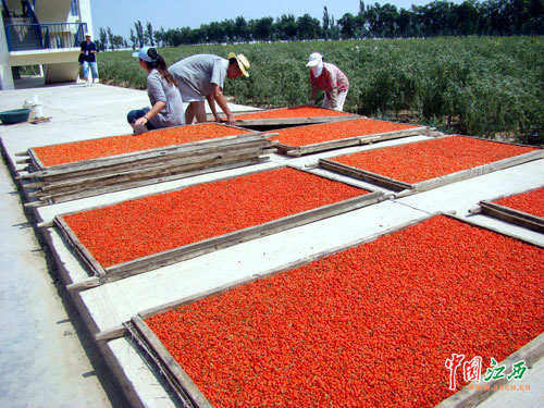 采摘的鲜枸杞集中晒干,场景甚为壮观。(江西网记者 吴辉军 摄)