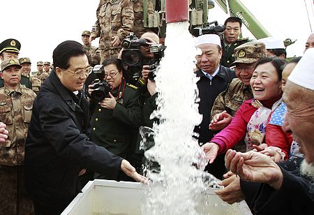 3月21日至23日,中共中央总书记、国家主席、中央军委主席胡锦涛在宁夏回族自治区考察工作。这是胡锦涛在银川市永宁县胜利乡园林村兰州军区给水工程团打井施工点,同当地群众一道高兴地用手捧起部队刚刚打出的井水。新华社记者 李学仁 摄