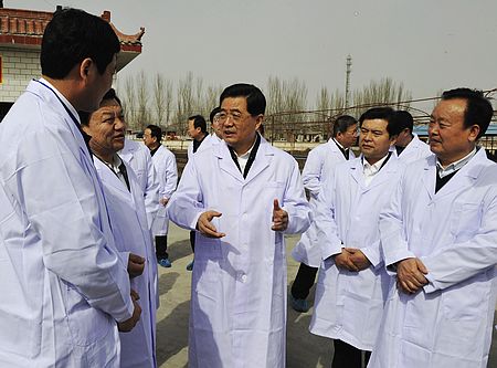 中共中央总书记、国家主席、中央军委主席胡锦涛在宁夏回族自治区党委书记陈建国、自治区主席王正伟等领导的陪同下,视察宁夏塞上阳光牧场。新华社记者 李学仁 摄