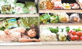 女大学生披薄纱蜷入冰柜