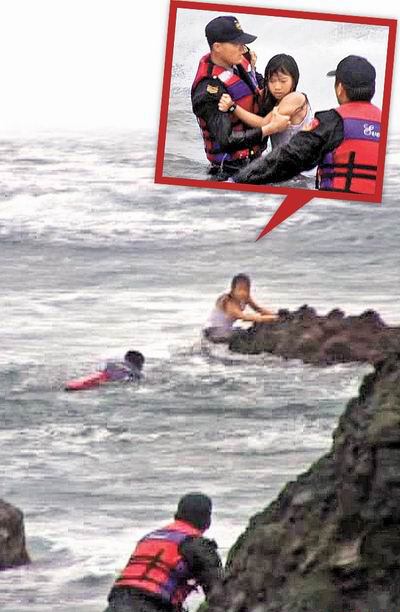 岸巡人员冒6级风浪下海,救援受困礁石的男女学生(图),女学生获救后一脸狼狈(小图)。(图片来自台湾媒体)
