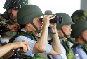 马英九戴钢盔穿防弹衣校阅台军实弹演习