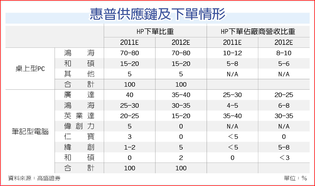 不过,也有法人指出,如分拆的接手对象为韩厂三星,则转单风险大增,在后市仍有变量下,市场倾向保守以对。鸿海一直是惠普的主力代工厂,专攻桌上型计算机、服务器、打印机等产品的制造,如惠普分拆后出现转单状况,对鸿海冲击最大。(中国台湾网 吴斌)