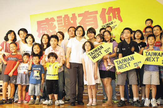 蔡英文(中)上午与小额捐款的民众合影留念,不少民众携家带眷与蔡英文拍照,蔡英文并邀请现场小朋友一同合影。图片来源:台湾《联合晚报》