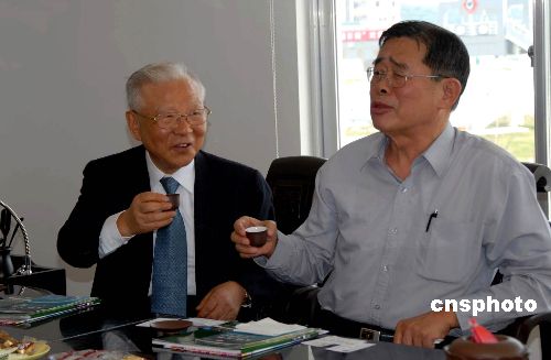 以台湾新同盟会会长许历农在天福茶博物院与天福集团总裁李瑞河(右)品茗交谈。 中新社发 蓝智伟 摄