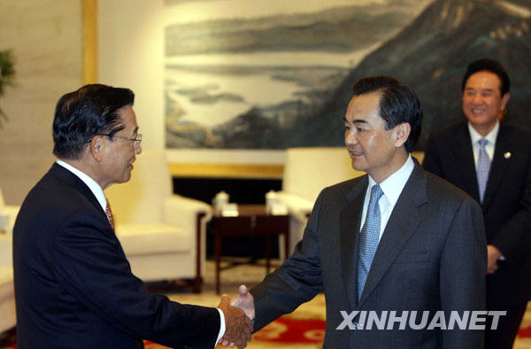 4月26日,中共中央台办主任王毅在江苏南京紫金山庄会见海基会董事长江丙坤和海基会协商代表团一行。新华社记者邢广利摄