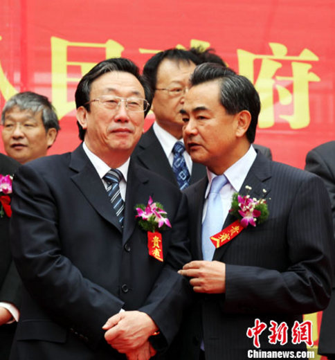9月28日,国务院台湾事务办公室主任王毅(右)在开幕式上与河南省长郭庚茂亲密交谈。当日,为进一步深化豫台间经贸、文化、旅游、教育等领域的合作,由国务院台办和河南省人民政府联合主办以“同根同祖同源,交流合作发展”为主题的“2010河南台湾月”活动在郑州开幕。中新社记者 王中举 摄