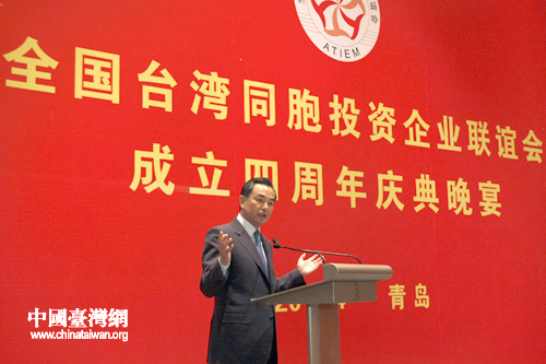 四度春秋,两任会长,一本如初。四年来,在台企联的带领下,广大会员首先在各自的投资地为当地经济社会发展做出了重要贡献;同时用自己的成绩和汗水,擦亮了台企联这个品牌,使台企联成为两岸关系进程中一支不可忽视、非常重要的积极力量。在这里我还要特别讲的是,台企联的广大会员朋友们以两岸同胞福祉为念,以中华民族的根本利益为重,积极参与和致力于两岸交流与合作,为两岸关系的改善和发展发挥了重要作用。同时,许多台商朋友还以不同的方式承担了作为一个企业的社会责任,履行了作为一个企业家的道德追求。大约在半年多之前,我收到山东临沂两位女学生寄来的一封信。信中讲述了一个感人的故事:正在大学就读的两姐妹入学之后,由于家庭变故,面临辍学的可能。在她们感到无助的时候,一位台商走到了她们身边,向她们伸出了援助之手,承担了她们上学所需的全部费用,用他那颗博爱的心使姐妹俩实现了求学的梦想。其实不光是这两个人,实际上这位台商十几年来默默无闻的在当地资助了100多位困难的大陆子弟,这100多位大陆子弟都把他当作亲人,对他充满了感恩之情。扶危济困,善莫大焉。这位台商的名字叫——刘竹承,今天他就在现场,让我们向他表示敬意和感谢!其实像刘先生这样的台商还有很多,他们都在力所能及的范围内默默地奉献。我想正是有这么一大批人的存在,才把两岸民众的心更加紧密的连接在一起,他们才是两岸关系中最为宝贵的财富。
