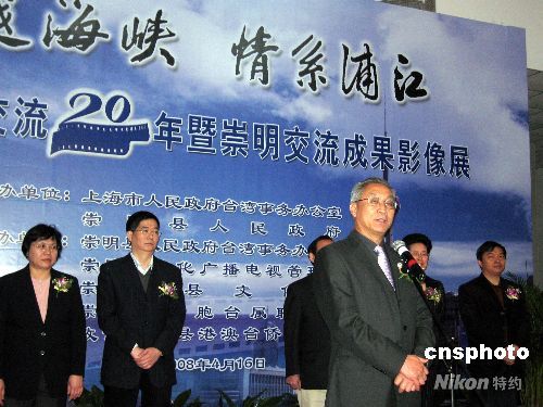 4月16日,“跨越海峡·情系浦江——沪台交流20年影像巡展”在上海崇明岛开幕。海峡两岸关系协会副会长张铭清、台北市崇明同乡会参访团等一同参观影像展,并进行沟通交流。图为张铭清在开幕式上表示,期盼两岸交流开创新局。 中新社发 许晓青 摄