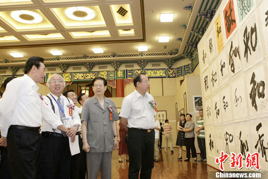 海协会会长、全国政协港澳台侨委员会主任陈云林出席海峡两岸书画作品展开幕式并会见参展的两岸艺术家。中新社发 盛佳鹏 摄