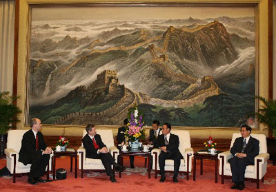 1月10日,全国人大常委会委员长吴邦国在北京会见由共同主席柯克和拉森率领的美国国会众议院美中工作小组代表团。(新华社记者樊如钧摄)