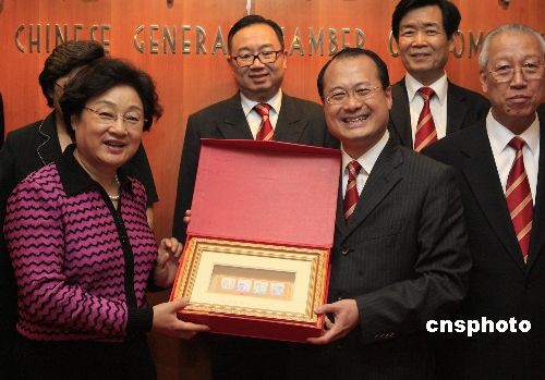简短会谈之后,宾主互赠礼物。中华总商会向国侨办赠送商会百周年纪念邮票一套,李海峰代表国侨办回赠工笔国画《国色天香》。