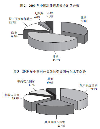 中国对外援助地理分布比较均衡。受援国涉及亚洲、非洲、拉丁美洲、加勒比、大洋洲和东欧等地区大部分发展中国家。中国对其中最不发达国家和其他低收入国家的援助比重始终保持在2/3左右。截至2009年底,中国累计向161个国家以及30多个国际和区域组织提供了援助,经常性接受中国援助的发展中国家有123个,其中亚洲30个、非洲51个、拉丁美洲和加勒比18个、大洋洲12个、东欧12个。亚洲和非洲作为贫困人口最多的两个地区,接受了中国80%左右的援助。