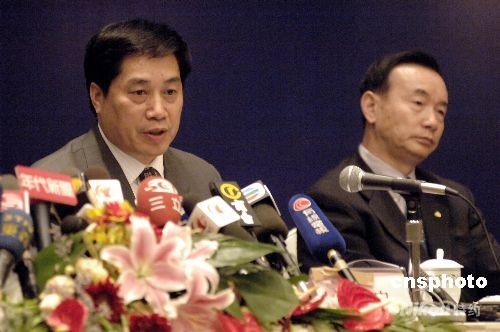 国家旅游局6月30日在北京举行新闻发布会,国家旅游局新闻发言人、海峡两岸旅游交流协会秘书长祝善忠(左)宣布,大陆居民赴台旅游首发团由首发旅游团和首发旅游交流考察团组成,共760人,团长由国家旅游局局长邵琪伟以海峡两岸旅游交流协会会长身份担任。首发旅游交流考察团行程七天,首发旅游团行程十天。目前有关工作已基本就绪。 中新社发 徐曦弋 摄