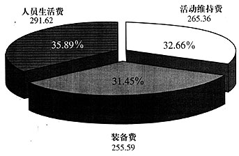 1997年度中国国防费的构成为(图表1):人员生活费291.62亿元人民币,占35.89%;活动维持费265.36亿元人民币,占32.66%;装备费255.59亿元人民币,占31.45%。从上述构成可以看出,国防费的大部分用于人员生活和正常活动维持,而且还负担了40多亿元人民币的社会性支出,约占年度国防费的5%。