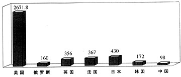 图表2 1997年度中国国防费与部分国家国防费比较(单位:亿美元)