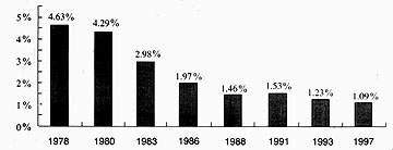 图表3 1978-1997年中国国防费占国内生产总值(GDP)比例