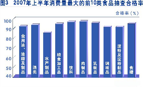 三是重点行业的食品质量达到较高水平。经过对食品生产加工企业的专项整顿,中国28大类525种食品质量安全水平都有不同程度的提高,特别是日常大量消费的重点行业的食品质量提高显著。据统计,中国消费量最大的前10类食品分别为:食用油、油脂及制品,酒类,水产制品,粮食加工品,饮料,肉制品,乳制品,调味品,淀粉及淀粉制品,食糖。2007年上半年,除水产制品抽样合格率为85%外,其余9类食品专项抽查合格率均在90%以上,肉制品抽样合格率达到97.6%(见图3)。